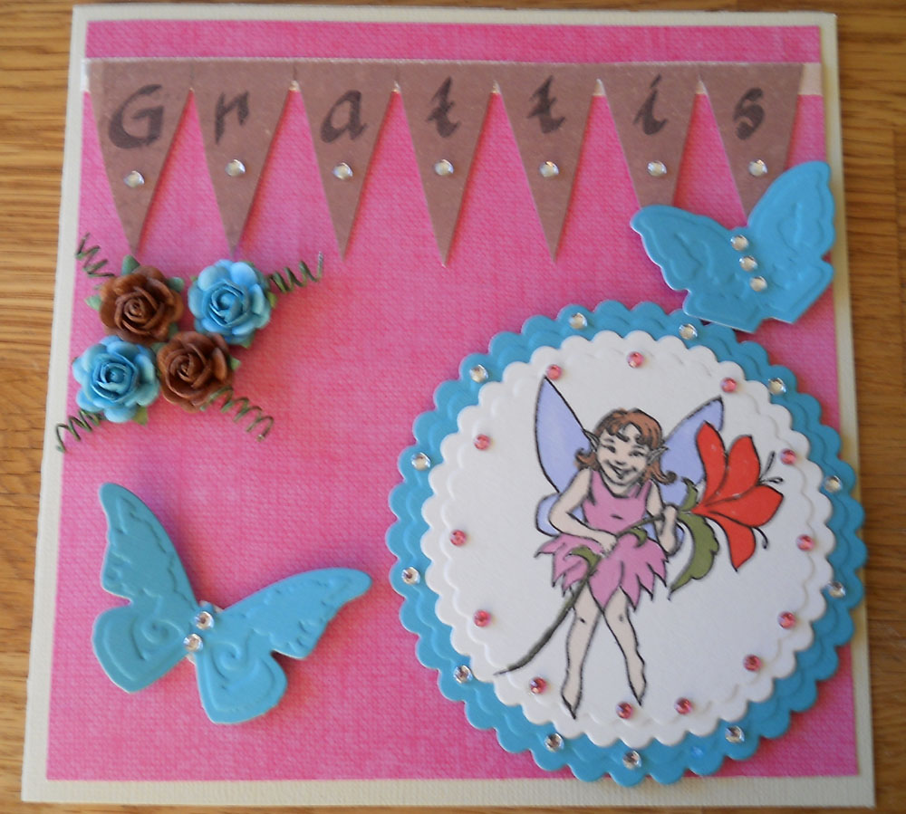 | Det som glittrar, även om det inte syns så bra på fotot, är rhinestones runt stämpeln, på fjärilarna och även på vimplarna. |